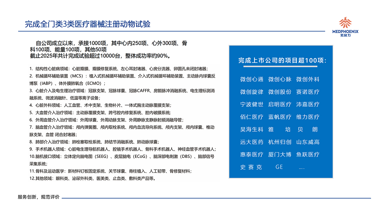 美鳳力團(tuán)隊(duì)帶頭人魏旭峰博士,曾是第四軍醫(yī)大學(xué)西京醫(yī)院心血管外科醫(yī)生,曾長期為 FDA完成高端醫(yī)療器械的臨床前大動(dòng)物試驗(yàn),完成 GLP 實(shí)驗(yàn)室對全球創(chuàng)新產(chǎn)品人工心臟、人工肺的 FDA 臨床前大動(dòng)物試驗(yàn)研究,擁有 20 多年的臨床醫(yī)學(xué)經(jīng)驗(yàn)和大動(dòng)物試驗(yàn)經(jīng)驗(yàn)。美鳳力組建了一支國際化的研究型醫(yī)學(xué)人才隊(duì)伍,聚集了近 100 名來自國內(nèi)外知名醫(yī)院的具有博士學(xué)位的醫(yī)生,涵蓋臨床各個(gè)學(xué)科。團(tuán)隊(duì)已完成心血管、腦血管、骨科、新材料、皮膚、手術(shù)機(jī)器人等全科分類的醫(yī)療器械臨床前大動(dòng)物試驗(yàn)超 10000 臺(tái)手術(shù)。