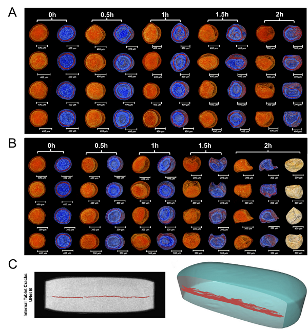 圖3 以結(jié)構(gòu)為基礎的制劑評價:(A)腸溶微丸在體外溶出過程的結(jié)構(gòu)演變;(B)腸溶微丸在體內(nèi)溶出過程的結(jié)構(gòu)演變;(C)片劑中縫隙的檢測