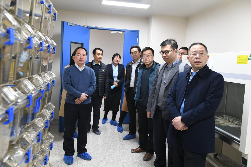實(shí)驗(yàn)動(dòng)物中心劉恩岐主任向呂毅副校長(zhǎng)等詳細(xì)介紹了創(chuàng)新港實(shí)驗(yàn)動(dòng)物中心規(guī)劃、I期建設(shè)、新增設(shè)施設(shè)備以及后期啟用計(jì)劃人員配置等,現(xiàn)場(chǎng)介紹了實(shí)驗(yàn)動(dòng)物平臺(tái)大小鼠飼養(yǎng)區(qū)、斑馬魚(yú)飼養(yǎng)區(qū)、大動(dòng)物手術(shù)室、大動(dòng)物飼養(yǎng)區(qū)、ABSL-2實(shí)驗(yàn)室等。