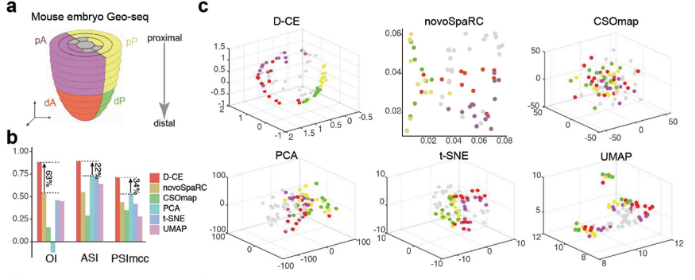 圖2.利用D-CE和現(xiàn)有方法從寡細胞/單細胞轉錄組數(shù)據(jù)重構其空間位置信息。a)示意圖顯示了小鼠胚胎E7.5中的4個空間域pA、dA、pP和dP。b) D-CE、novoSpaRC、CSOmap、PCA、t-SNE和UMAP所獲得的OI、ASI和PSImcc評分。這些分數(shù)衡量重構的準確性,更高的分數(shù)代表更高的準確性。c)利用D-CE、novoSpaRC、CSOmap、PCA、t-SNE和UMAP重構的小鼠胚胎組織空間結構