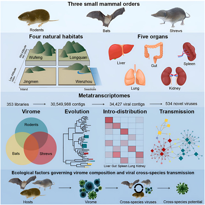 在這項新的研究中,這些作者利用宏轉(zhuǎn)錄組測序技術對來自中國四個棲息地的2443只野生蝙蝠、嚙齒動物和鼩鼱的內(nèi)臟器官和糞便樣本進行了測序。幾乎所有被研究的動物體內(nèi)都發(fā)現(xiàn)了病毒。
