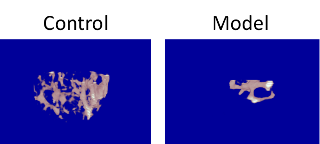 小鼠股骨干骺端三維重建圖,模型組小鼠骨密度明顯下降。