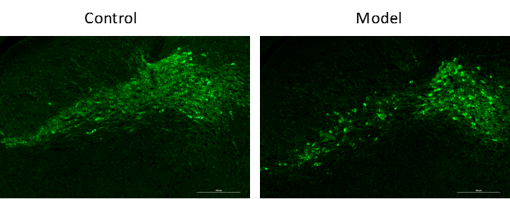 ②右:前囟前 1.0mm,矢狀縫右側 3.5mm,顱骨骨膜下 4.5mm;用顱骨鉆沿注射坐標位點鉆孔, 以保證微量注射器進針時不碰到孔壁;微量注射器吸取 6-OHDA(注意避光);首先按坐標位點注射 6-OHDA,注射劑量為4μl(濃度 2μg/μl),注射速度0.5ul/min,注射結束后留針 5min,然后緩慢退針;以前囟點為原點,重新定位第二個注射位點注射;最后一次退針后止血、消毒、針線縫合切口,將大鼠放入籠中,注意保溫。對照組造模具體步驟同上,把 6-OHDA換成生理鹽水。