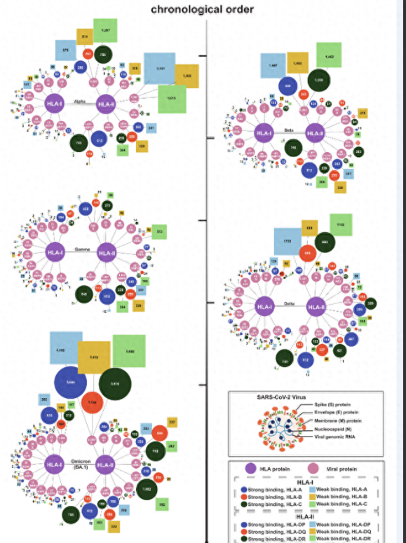 圖1. 不同SARS-COV2毒株與蛋白質(zhì)結(jié)合的HLA等位基因的累積數(shù)量.