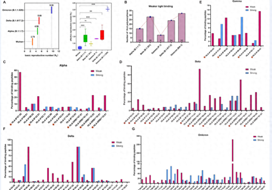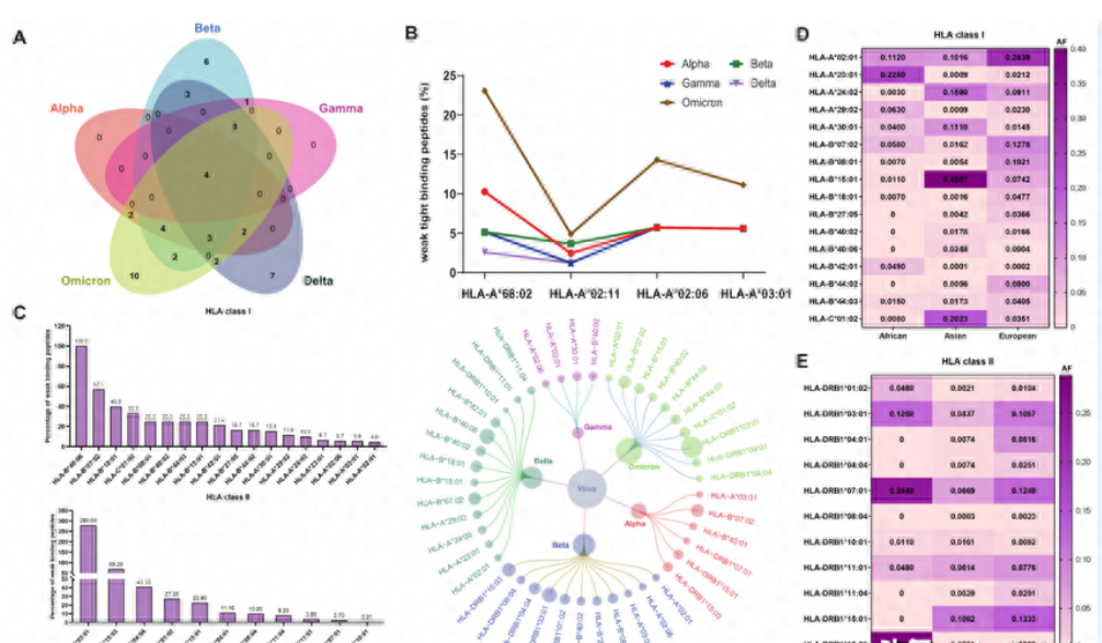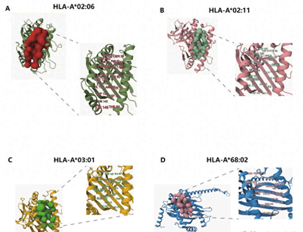 由 SARS-CoV-2 引起的 COVID-19 大流行導(dǎo)致數(shù)百萬人死亡。由于病毒新突變和免疫逃避,SARS-CoV-2的傳播力非常迅速。然而,相關(guān)機(jī)制仍不清楚。本研究從T-CoV數(shù)據(jù)庫中獲得SARS-CoV-2變異體與HLA多態(tài)性之間的親和力數(shù)據(jù)。文獻(xiàn)中確定了關(guān)注變體(VOC)的流行病學(xué)數(shù)據(jù)。HLA蛋白序列從 IPD-IMGT/HLA獲得。使用AlphaFold預(yù)測蛋白質(zhì)結(jié)構(gòu),并使用PrankWeb 3預(yù)測HLA分子的結(jié)合位點(diǎn)。結(jié)果獲得了 SARS-CoV-2 毒株與不同 HLA 蛋白的結(jié)合親和力,并鑒定了 31 個(gè)風(fēng)險(xiǎn)等位基因。 隨后的結(jié)構(gòu)預(yù)測確定了這些 HLA 蛋白中的 10 個(gè)可能促進(jìn)免疫逃避的活性結(jié)合位點(diǎn)。 特別地,還發(fā)現(xiàn)與 HLA I 類多態(tài)性的弱結(jié)合能力可能有助于 Omicron 的免疫逃避??傊?,本研究重點(diǎn)關(guān)注 HLA 多態(tài)性與 SARS-CoV-2 毒株的結(jié)合親和力及其與 SARS-CoV-2 免疫逃避的關(guān)系。 研究結(jié)果對(duì)于防止 SARS-CoV-2 的免疫逃避具有重要意義,并為疫苗設(shè)計(jì)提供了新的見解。