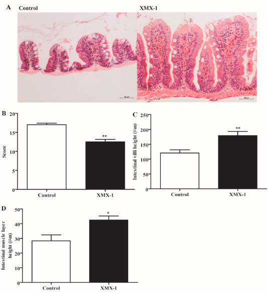 圖2、對照和含XMX-1日糧對斑馬魚腸道形態(tài)的影響(A)H&E染色的代表性腸道組織學圖像。(B) 腸道組織學評分,(C)腸絨毛高度評分,(D)腸肌層評分。