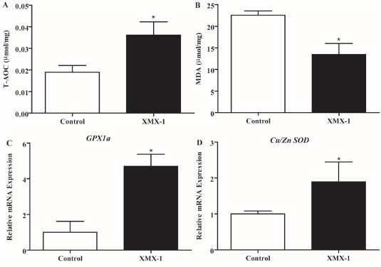 圖 4、 含XMX-1日糧對腸道T-AOC、MDA水平及GPX1α和Cu/Zn SOD表達的影響