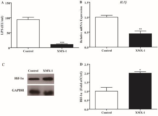 圖 3 、含XMX-1 日糧對血清 LPS 水平、IL-1β 表達及 Hif-1α 蛋白免疫印跡分析的影響
