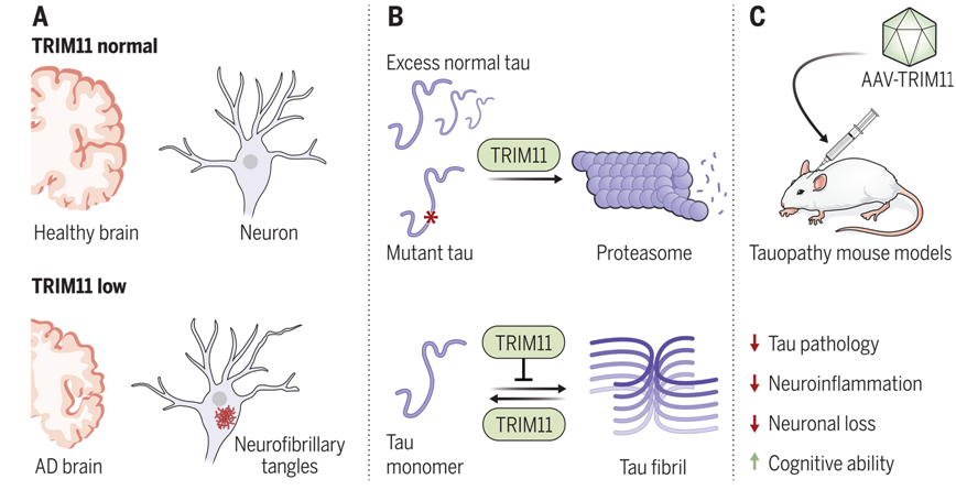 在一項(xiàng)新的研究中,來自美國(guó)賓夕法尼亞大學(xué)佩雷爾曼醫(yī)學(xué)院的研究人員發(fā)現(xiàn),一個(gè)編碼與tau產(chǎn)生有關(guān)的蛋白---TRIM11(tripartite motif protein 11)---的基因可以抑制類似阿爾茨海默?。ˋD)的神經(jīng)退行性疾病小型動(dòng)物模型的惡化,同時(shí)改善認(rèn)知和運(yùn)動(dòng)能力。此外,他們還發(fā)現(xiàn)TRIM11在消除導(dǎo)致神經(jīng)退行性疾?。ㄈ绨柶澓D。┑牡鞍桌p結(jié)物方面發(fā)揮著關(guān)鍵作用。相關(guān)研究結(jié)果發(fā)表在2023年7月28日的Science期刊上,論文標(biāo)題為“TRIM11 protects against tauopathies and is down-regulated in Alzheimer’s disease”。