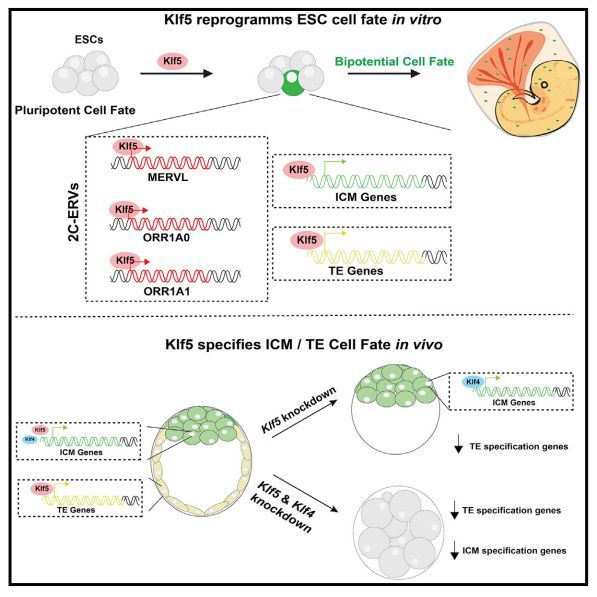 通過使用三種2c特異性erv作為雙電位細(xì)胞命運的標(biāo)志,我們發(fā)現(xiàn)克虜伯樣因子(Klf5)是賦予胚胎和胚胎外系發(fā)育潛力的重要調(diào)控因子。雖然之前的研究已經(jīng)描述了Klf5敲除胚胎的著床前缺陷,但Klf5在雙電位細(xì)胞命運中的功能重要性,以及Klf5與其他Klf轉(zhuǎn)錄因子在著床前發(fā)育中的功能相互作用在很大程度上仍不清楚。